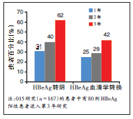 在本届年会上,北京首都医科大学的贾继东教授公布了替比夫定治疗中国患者3年的数据,患者接受替比夫定治疗3年,可分别获得62%的HBeAg转阴率及42%的HBeAg血清学转换率(图1)。