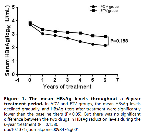 ADV或ETV长期治疗期间血浆HBsAg滴度均逐渐降低。显示ADV所致HBsAg减少的效力与ETV接近,只要患者已经达到持续病毒抑制。