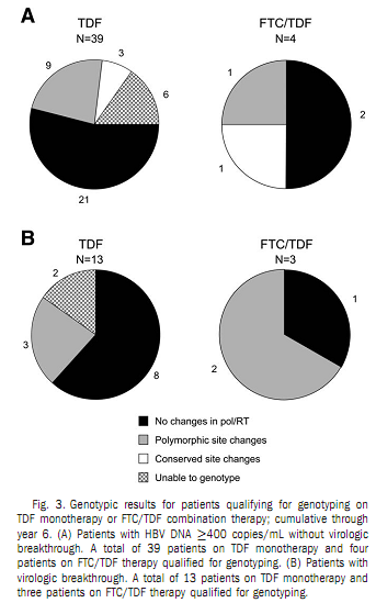 与基线相比,符合分型的开放标签治疗组患者中有约半数出现pol/RT序列变化(TDF治疗组23/52 [44 %],FTC/TDF治疗组4/7[57%])。大多数变化发生于多态位点,均与TDF耐药无关。病毒学突破不常发生,大多数病例与研究药物不依从有关(12/16 ,75%)。按照治疗方案,57例(10 %)适合转为FTC/TDF治疗 ,最后一次研究随访时,大多数HBV DNA < 400拷贝/ml,而与他们是否转为FTC / TDF(n= 34)或维持TDF单药治疗(n=17)无关 。240周后,没有患者出现持续病毒血症(血清HBV DNA从未< 400拷贝/ml)。