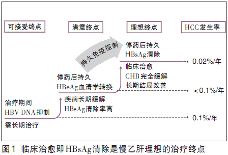 CHB治疗终点有三个:治疗期间乙型肝炎病毒(HBV)降至低于检测水平是欠满意的终点,获得这一应答仍需继续治疗,一旦停药复发率较高;停药后持久的乙型肝炎病毒e抗原(HBeAg)血清学转换是满意的治疗终点,达到这一治疗终点才有可能实现停药后不复发;停药后持久的HBsAg清除是理想的治疗终点。CHB治疗的长期目标是降低肝硬化、肝癌发生率,而HBsAg清除可最大化降低患者肝硬化、肝癌风险,被认为接近“治愈”。研究结果显示,治疗至单纯HBV DNA低于检测下限的患者,其肝癌年发生率为0.1%,而HBsAg清除者仅为0.02%,较前者下降5倍(图1)。