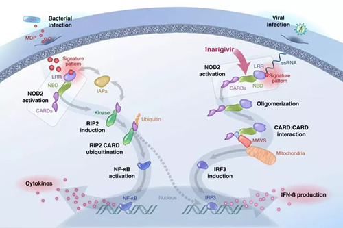 ▲ Inarigivir启动双重抗病毒机制:抑制病毒复制,与RIG-I结合的Inarigivir防止病毒聚合酶参与病毒RNA的复制;促进病毒清除,活化的RIG-I诱导内源性IFN产生。(图片来源:Spring Bank Pharmaceuticals官网)